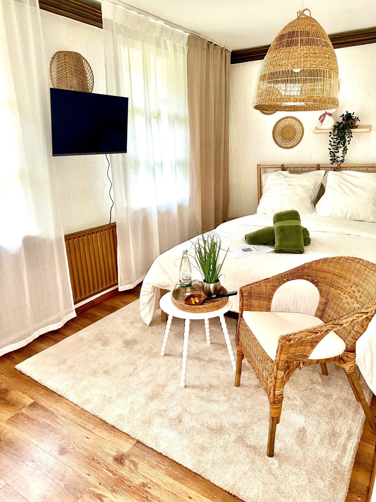 La maison indépendante de notre maison d'habitation (nous vivons juste à côté) se compose de deux chambres et d'une salle de bains. Dans le salon, il y a aussi une petite kitchenette avec 2 plaques de cuisson, vaisselle, machine à café (Senseo), micro-ondes, etc. Le lit dans la chambre a la taille 160x200. La salle de douche est reliée entre les deux chambres. Une place de parking est juste devant la maison.
