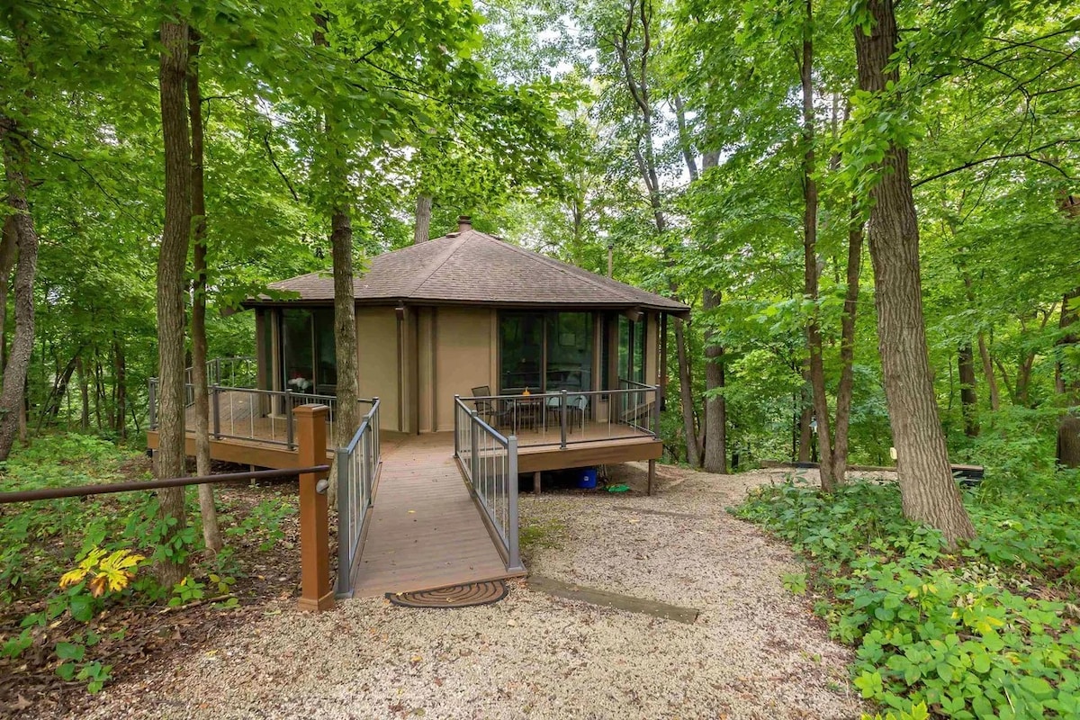 « Cabane dans les arbres » unique : une petite maison octogonale, entourée de bois ! Maison de 2 chambres et 2 salles de bain où vous pourrez profiter de la vue sur la nature tout autour, avec des fenêtres du sol au plafond. Un lit King Size, un lit Queen Size. Confort moderne avec des touches noires amusantes. Jacuzzi privé et foyer donnent sur des bois sereins ! Asseyez-vous près de la cheminée à gaz intérieure et profitez de notre collection de disques. Plongez dans une baignoire japonaise. Profitez des couleurs de l'automne ou regardez la neige tomber ! Piscine intérieure communautaire, piscine extérieure saisonnière, accès à la salle de sport.