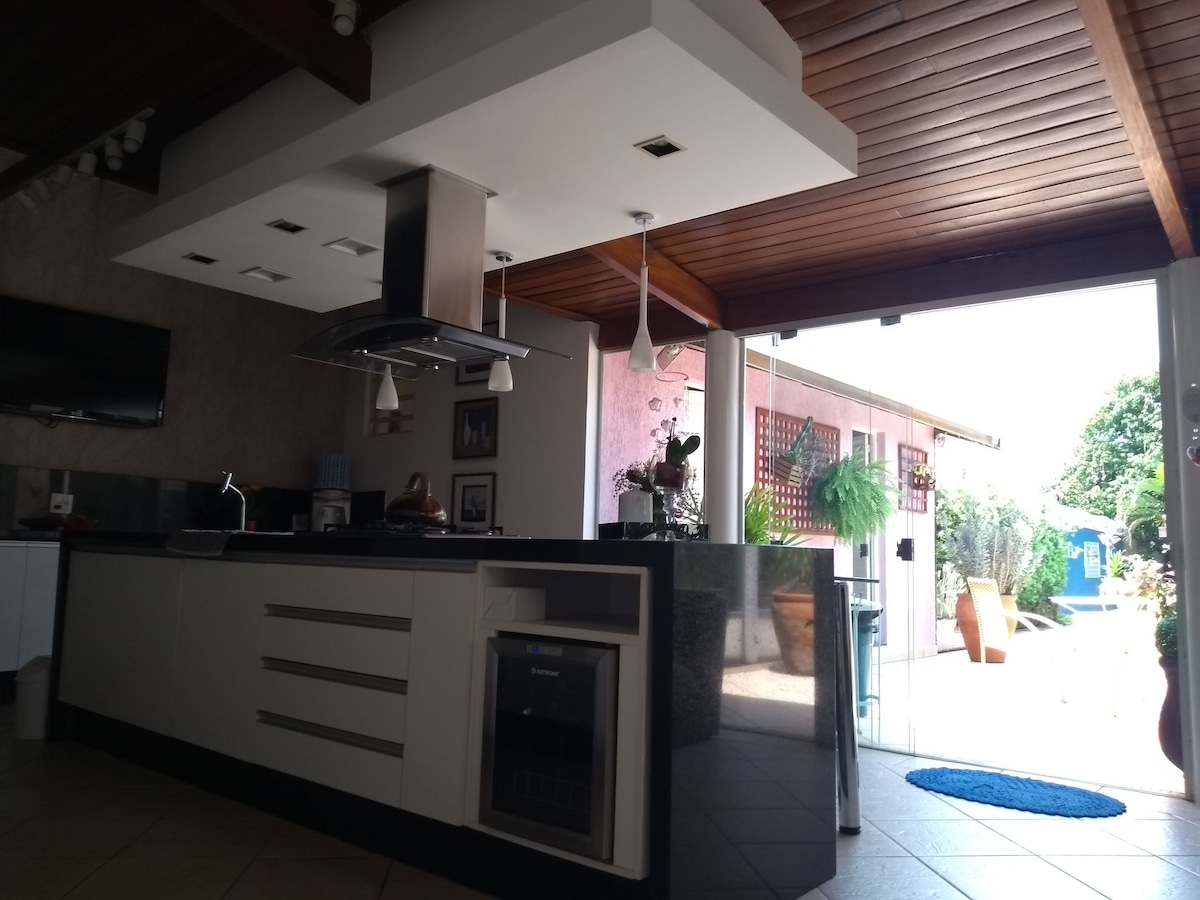 PACK DE NOËL DISPONIBLE Maison avec confort et esthétique qui plaît aux personnes les plus exigeantes, cheminée finlandaise au centre du salon et de la salle à manger, environnement accueillant et sûr avec bars et alarmes, literie super confortable et cuisine complète, venez profiter ! Espace extérieur pour beaucoup de loisirs : immense piscine et barbecue ; salle de bal ; cuisine extérieure complète ; four à pizza ; étang ornemental ; garage couvert 8 voitures ; jacuzzi ; produits biologiques ; espace pour le ✔feu sonore pour les animaux de compagnie