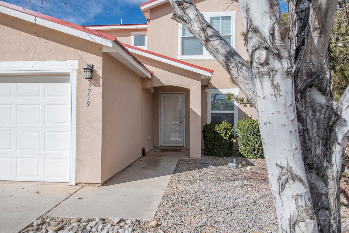 Cette maison de ville de style Santa Fe est bien équipée pour cuisiner et se détendre. La cuisine et les salles de bain ont été récemment rénovées. La chambre principale a un lit Sleep Number, la 2e a un nouveau matelas moelleux. L'espace extérieur est paisible avec un foyer à gaz relaxant et des jeux pour les enfants! * 2025 : récemment ajouté : Air réfrigéré ! ! > 4 billets de tramway Sandia 🎉 gratuits — une valeur de 136 $ US! Il suffit de donner un préavis de 2 à 4 semaines à votre hôte, Teresa. Les billets sont limités et ne sont pas disponibles pendant l'ABQ Ballo.