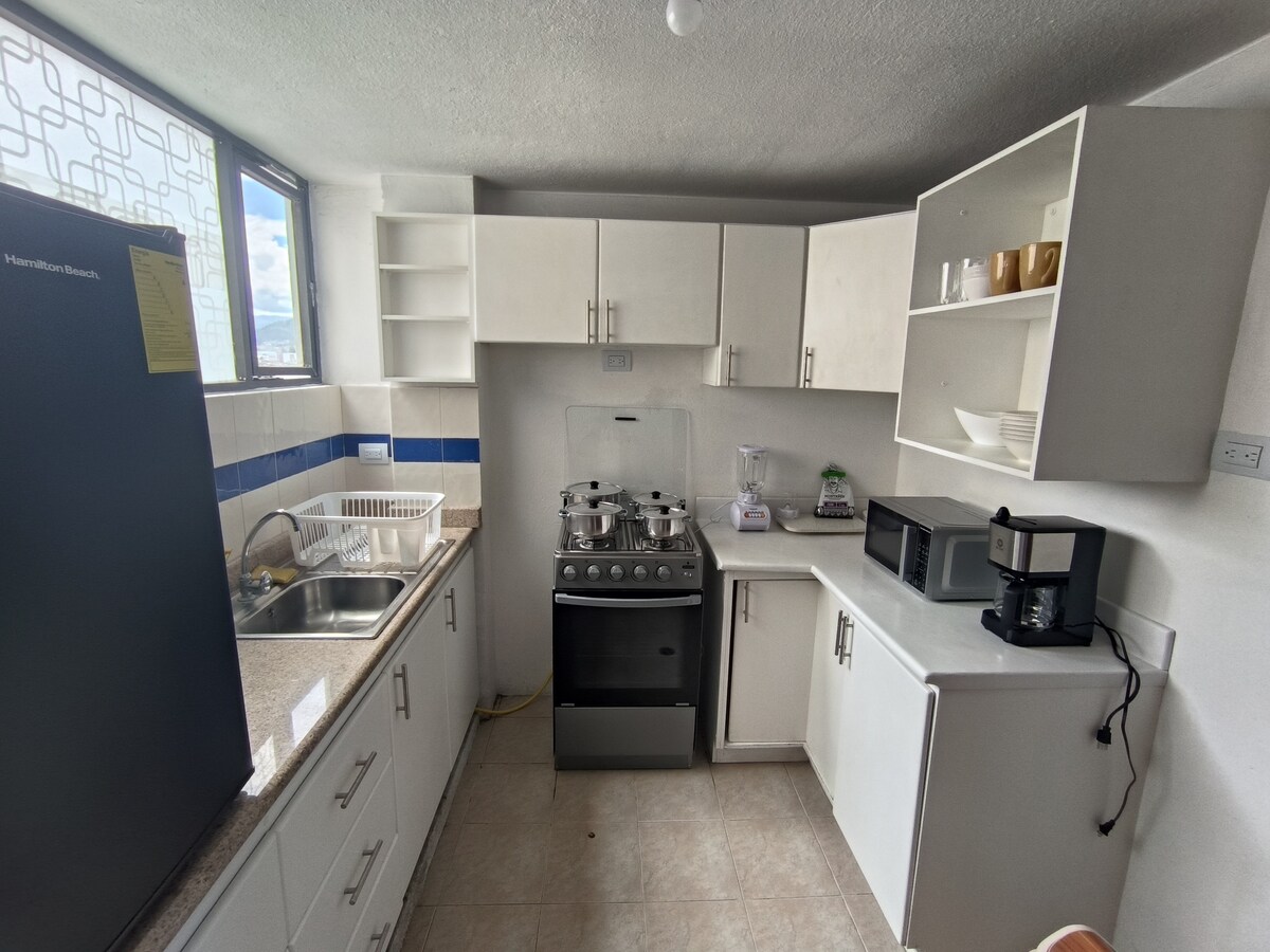 Appartement de luxe à Riobamba avec Wi-Fi 850 Mbps, stationnement et vue panoramique. Situé dans la tour Napoli, à quelques pas de la Zona Rosa, des restaurants, des banques et des épiceries, dans un environnement calme. Il dispose de 2 chambres, de 2 salles de bain complètes, d'un canapé-lit, d'une salle à manger pour 6 personnes, d'une cuisine équipée, d'un lave-linge et d'un sèche-linge, ainsi que d'une télévision intelligente de 55 po avec Chromecast, Netflix, Spotify et Google Nest. Accès par carte, serrure intelligente et sécurité maximale.
