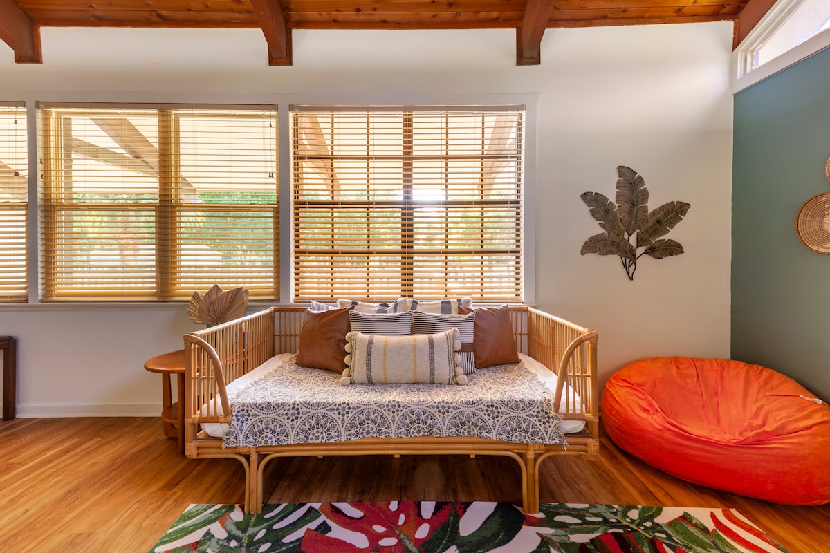 Bienvenue à Green Turtle A. Située à moins d'un mile du magnifique centre-ville de Stuart, cette maison confortable, mais très spacieuse, de 2 chambres et 1 salle de bain peut accueillir 7 personnes, avec un lit King Size, des lits jumeaux superposés Queen Size et un canapé-lit. Le porche avant fermé dispose d'une table pour 4 personnes pour profiter d'un café ou d'un jeu de cartes ainsi que d'un espace de bureau dédié. Grande cuisine fonctionnelle avec salle à manger pour 6 personnes. Le porche arrière dispose d'une table à manger pour 6 personnes et d'une cour clôturée pour garder vos petits humains ou chiens en sécurité. Buanderie sur place. Pas de chats.