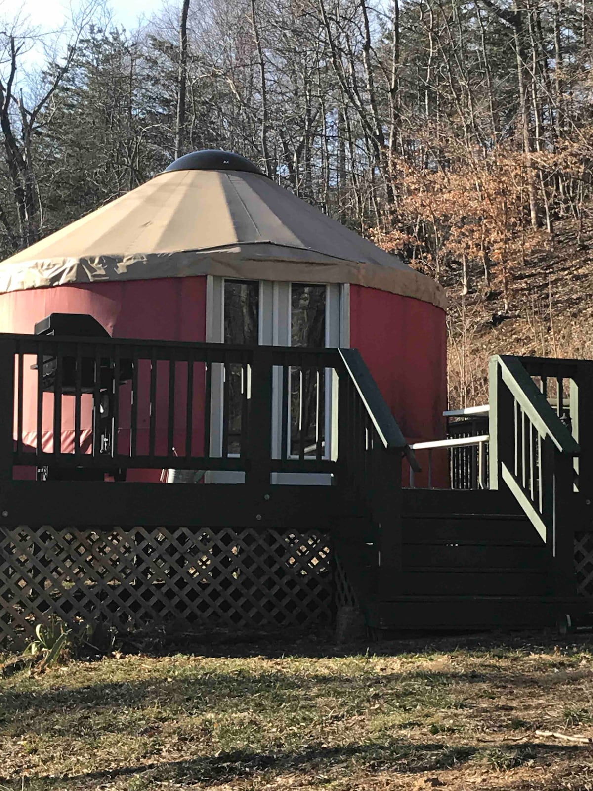 Évadez-vous dans la Virginie rurale. Yourte isolée avec terrasse privée, toilettes sèches et allée. Située dans un environnement magnifique et paisible. Douches chaudes et toilettes à chasse d'eau à 215 pas. Grand espace agréable avec lit double, canapé-lit simple, espace de rangement, table et chaises. Table de pique-nique extérieure et barbecue couvert et plaque chauffante attachée avec propane fourni. Petit déjeuner de style continental fourni. Pas d'électricité. Chauffage Buddy pour les jours frais. Animaux acceptés. Les chiens sont les bienvenus (2 max)
