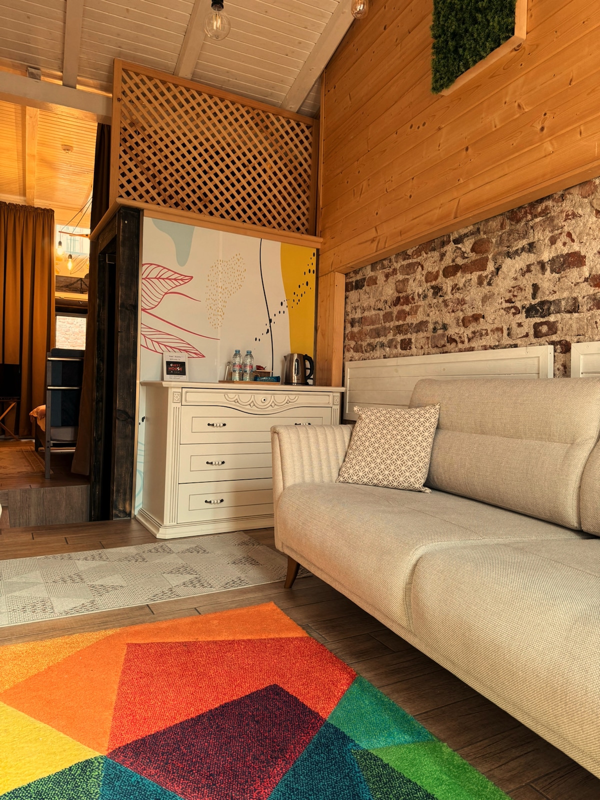 Découvrez notre suite haut de gamme, alliant confort et style dans une mezzanine chic. Le premier niveau vous accueille avec un grand lit double, agrémenté d'un canapé confortable et d'un fauteuil pour des moments sereins. Équipé de tout le nécessaire, il respire l'élégance et la commodité. Profitez de la télévision ou d'un livre dans cet espace accueillant. À l'étage, deux lits simples avec des matelas italiens haut de gamme offrent un havre de paix idéal pour les familles ou les grands groupes à la recherche de confort et de polyvalence.