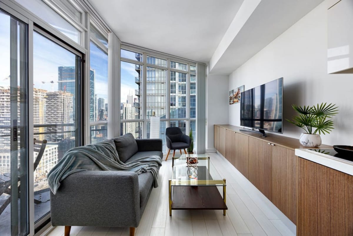 Spacieux appartement moderne d'une chambre + un salon situé au cœur du centre-ville. À quelques pas du lac, des parcs, des centres de loisirs. À quelques pas de la Tour CN, de la gare Union, du Centre Rogers et du Centre des congrès. → WIFI RAPIDE Parfait pour le travail à domicile, les appels vidéo et le streaming Taille → approximative 620 pi² / 57 m² → Espace de travail dédié. Télévision QLED→ 60" → *NOUVEAU 2024* Cuisine entièrement équipée avec ensemble d'ustensiles de cuisine À distance de→ marche des restaurants et des lieux de vie nocturne. À quelques→ minutes des épiceries, des magasins d'alcool et du réseau de transport en commun de la ville (score de transport en commun de 94).