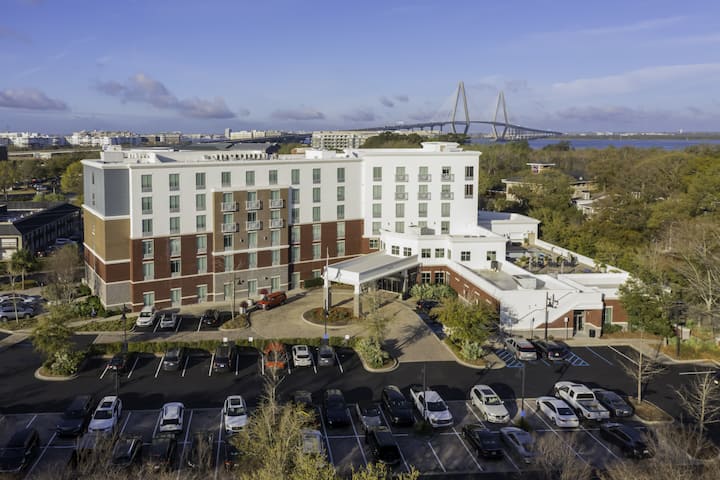 Rechargez vos batteries dans cette chambre avec très grand lit conçue pour le travail et la détente. Restez connecté avec le Wi-Fi rapide, diffusez vos favoris sur le téléviseur HD de 42 po et préparez une tasse de café avec votre Keurig dans la chambre. Une douche à l'italienne spacieuse, un bureau ergonomique et un mini-réfrigérateur rendent votre séjour fluide et sans effort, que vous soyez en ville pour Patriots Point, la plage ou les affaires.