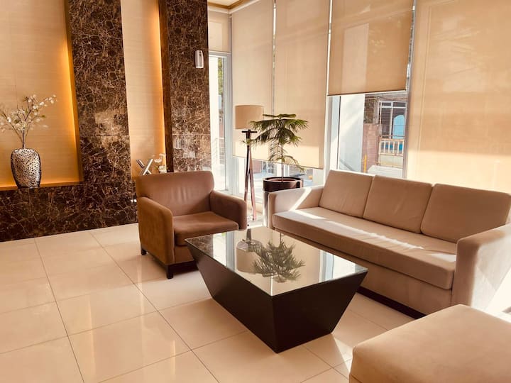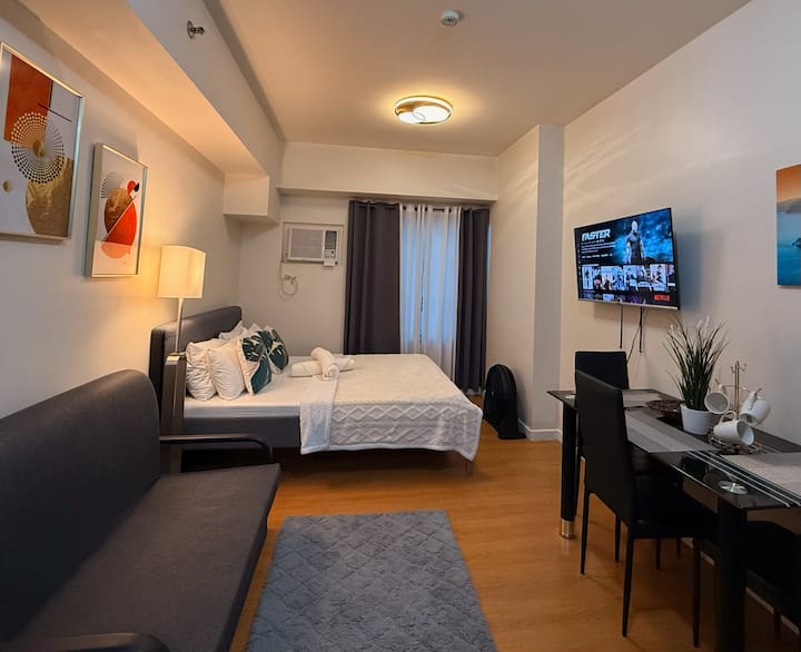 Profitez d'une expérience élégante dans notre logement central, équipé d'une connexion Wi-Fi rapide, compatible avec Netflix, d'une cuisine entièrement équipée, d'une salle de bain propre, d'un lit queen size confortable et d'un canapé-lit polyvalent. Nous sommes idéalement situés près de Robinsons Mall, UP, Supreme Court, St. Luke 's Medical Center Extension Clinic, PGH, et à seulement quelques pas de l'ambassade des États-Unis. Le stationnement est disponible pour 500 ₱ par nuit, sous réserve de disponibilité, et doit être réservé avant l'arrivée ou l'arrivée.