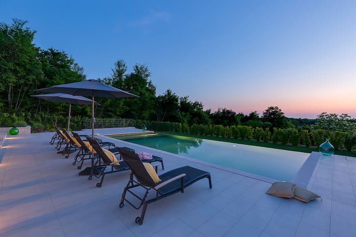 La luxueuse Villa Damian est située dans la paisible colonie de Medvidići, près de Sveti Lovreč, dans la partie ouest de l'Istrie. Il offre d'excellentes vacances pour 12 personnes, et dispose de 6 chambres, 5 salles de bains et un espace intérieur de 225 mètres carrés. Vous pourrez profiter de la vue imprenable sur la campagne pittoresque d'Istrie depuis la belle piscine extérieure ou le jacuzzi. Avec une cuisine d'été, un barbecue ou les services d'un chef personnel, vous pouvez vous détendre en compagnie de vos proches.