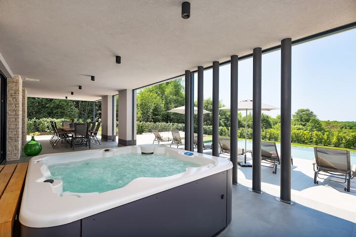 Le jardin de 702 m² est clos de tous les côtés par des haies et offre une belle vue sur la campagne istrienne. La piscine de 60 m², accessible par des escaliers, offre un rafraîchissement à toute heure de la journée. Une douche extérieure est également à votre disposition. La zone de bronzage au bord de la piscine est l'endroit idéal pour se détendre avec une bonne lecture estivale. Si vous souhaitez vous détendre à un autre endroit, vous pourrez essayer l'espace bien-être couvert avec un jacuzzi, où vous pourrez également profiter d'une belle vue. Dans un cadre tout aussi charmant, vous pourrez profiter de passer du temps avec vos proches sur la terrasse couverte, qui dispose d'une grande table pour 10 personnes, d'une cuisine d'été entièrement équipée et d'un barbecue au gaz. Pour le summum du luxe pendant votre séjour à la raffinée Villa Damian, des services de restauration d'un chef privé sont disponibles moyennant des frais supplémentaires.