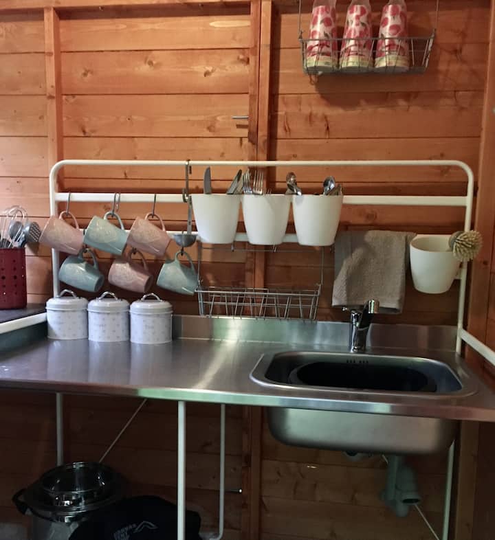 Bonjour, je m'appelle Mel et je vis ici avec mon mari, Rob, et trois chiens. Je suis un jardinier passionné et Rob est un apiculteur débutant, et nous adorons gérer notre petite exploitation et notre camping ici aux frontières du nord du Pays de Galles. Vous me verrez faire du poterie dans le jardin ou Rob bricoler dans l'atelier.