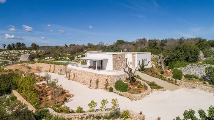 Imaginez une demeure imposante avec une vue imprenable qui s'étend jusqu'à l'horizon, entre les eaux de la mer Méditerranée, là où la mer Ionienne rencontre l'Adriatique dans une symphonie harmonieuse de couleurs et le léger tourbillon créé par les vagues. Les murs blancs de la villa brillent sous le soleil, tandis que la pierre l'embrasse avec grâce et élégance témoignant de siècles d'histoire, de culture et de savoir-faire artisanal du Salento. À l'intérieur, la villa vous accueillera avec de grands espaces blancs et lumineux, où chaque détail est soigné avec élégance, brio et raffinement.
