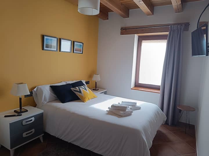 Chambre double avec lit double de 135 cm, avec salle de bain complète accessible aux personnes à mobilité réduite au rez-de-chaussée. Il dispose d'une armoire avec literie de renfort, d'un lavabo intégré dans la chambre, et d'une douche et de toilettes indépendantes avec sol sans relief avec éclairage naturel, gel douche et savon à main à disposition et sèche-cheveux. La fenêtre de la chambre, exposée plein sud, donne sur la rue latérale. Le plafond est à poutres apparentes et en bois vu, avec des murs blancs, en soulignant l'un en jaune et l'autre sur du papier peint, dans lequel se trouve le lavabo