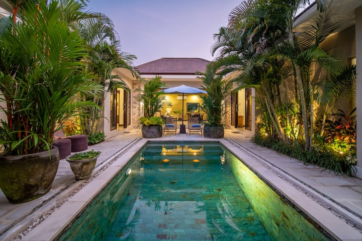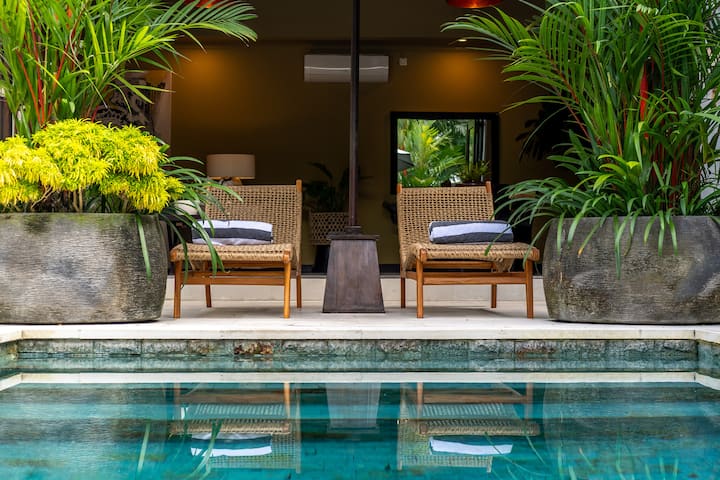 Passez par des portes balinaises sculptées pour entrer dans votre oasis privée avec une piscine cristalline, une bouée de nage et une cour luxuriante avec des chaises longues pour 6 personnes.