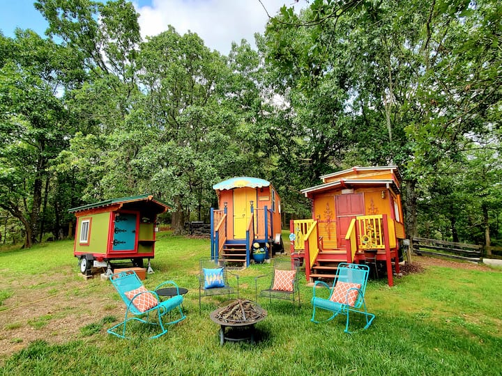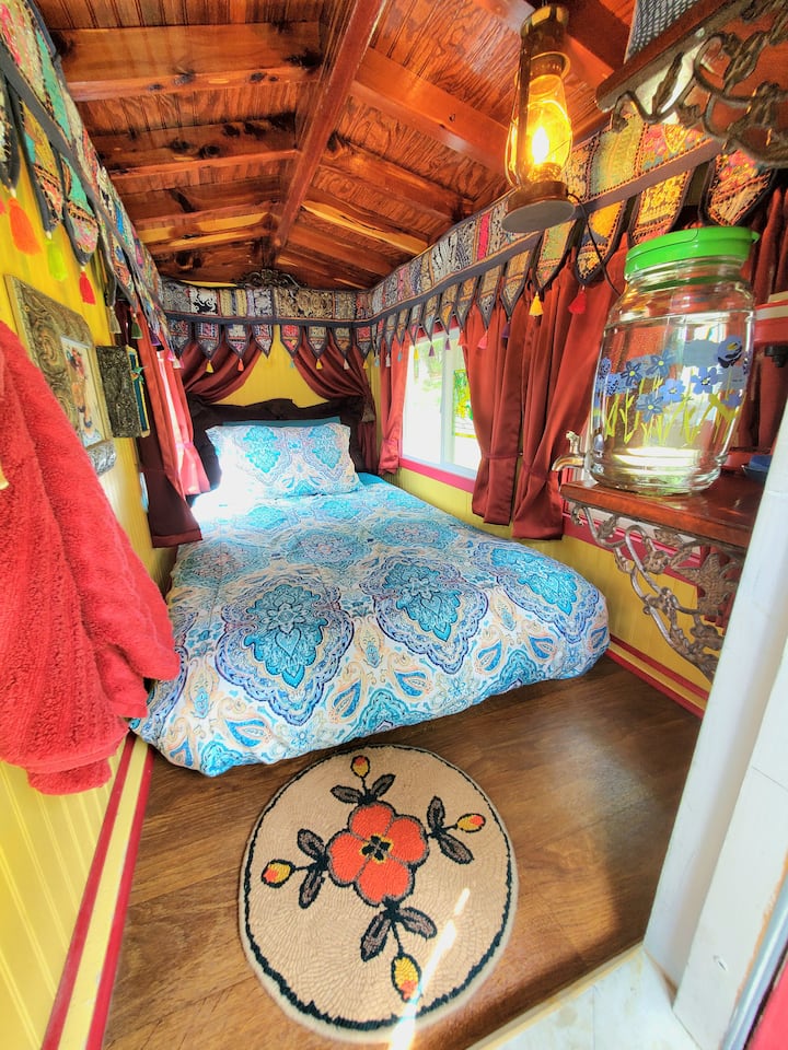 « The Hummingbird » wagon gitan, petite maison confortable et adorable, est une expérience de camping de luxe, autour d'un feu de camp, avec 2 autres wagons gitans.
