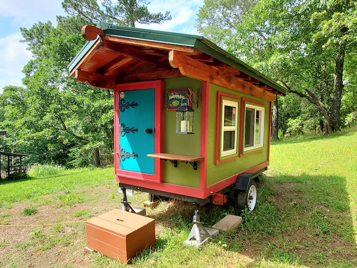(Veuillez noter que cette micro-maison confortable a beaucoup d'espace pour s'asseoir et se détendre, mais pas pour se tenir debout à l'intérieur, qui mesure 4,5 pieds de haut. Vous pouvez vous tenir sous le porche à l'entrée.)