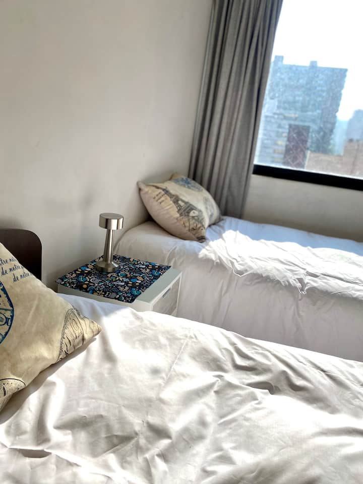 Une chambre privée dans un logement, incluant l'accès aux espaces partagés.