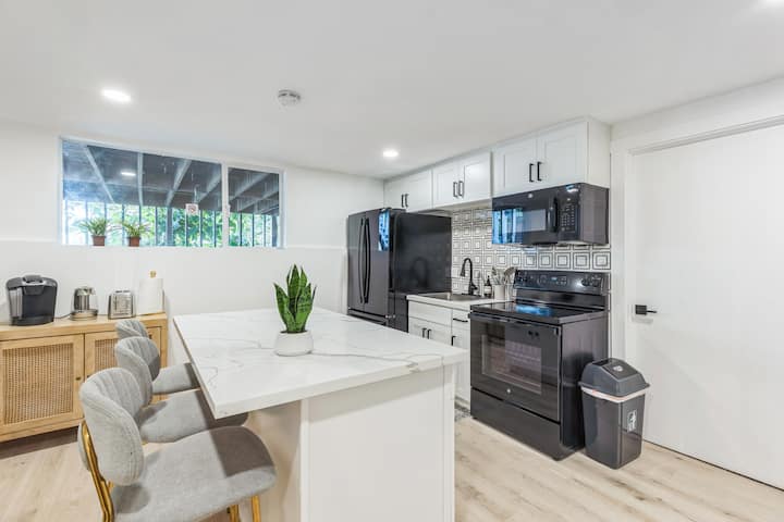 Bienvenue dans notre espace confortable d'une chambre avec deux lits queen size avec de luxueux draps en coton égyptien pour un confort ultime. Profitez de vos matins dans notre station de café bien approvisionnée et détendez-vous devant une télévision 55"pour vous divertir. Nous fournissons des serviettes et des couvertures blanches douces pour un séjour vraiment relaxant. Le logement dispose également d'une salle de bain complète avec douche et cuisine entièrement équipée, avec micro-ondes, réfrigérateur et tout le nécessaire pour cuisiner vos repas. C'est l'endroit idéal pour séjourner !