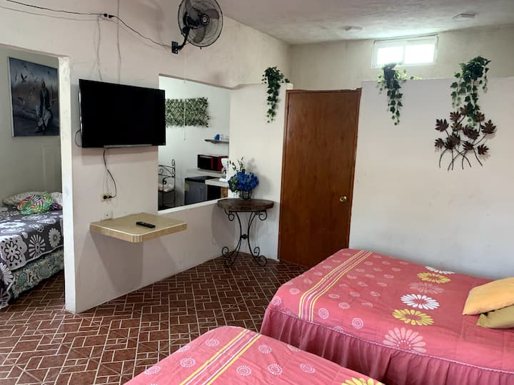 Les cabines sont spacieuses fraîches ont leur salle de bain privée eau chaude 24 h/24, télévision , Internet et nous sommes à 2 pâtés de maisons de la plage.