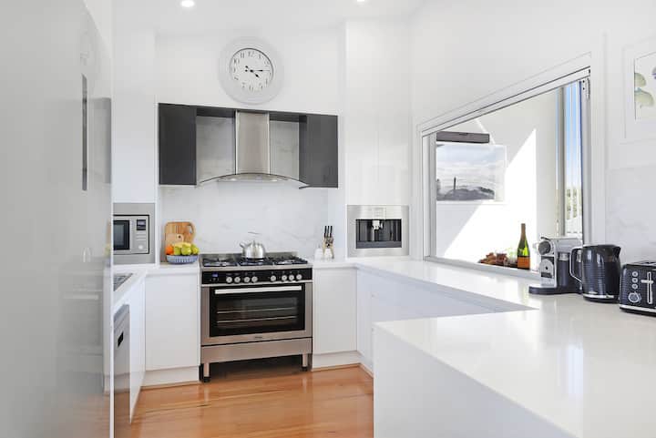 L'espace extérieur en plein air à l'étage est équipé d'un barbecue Weber Family Q, de meubles de salon et même d'une télévision extérieure, un cadre idéal pour profiter des après-midi d'été après une journée passée à Warilla Beach ou sur le lac. Deux autres téléviseurs et un mini haut-parleur pour les amateurs de musique sont également fournis. Les équipements de la cuisine, y compris une table de cuisson et un four à gaz de 90 cm, un lave-vaisselle et une machine à café intégrée, rendent la préparation des repas pratique et agréable, en particulier avec les fenêtres à deux volets qui s'ouvrent sur la zone Alfresco.