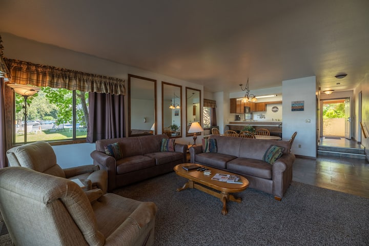 Nos condos de deux chambres au bord de l'eau offrent le confort et les commodités d'un chez-soi. Chacun dispose d'un éventail impressionnant de commodités pour vous, y compris un stationnement privé, une entrée à clé, un rangement pour l'équipement, une buanderie dans l'unité, une cuisine équipée d'outils et d'ustensiles culinaires prêts à cuisiner, un bar à déjeuner, une cheminée, un lit King Master avec salle de bain attenante, deux lits jumeaux dans la 2e chambre, deux canapés-lits, un patio ou une terrasse, un accès à des grils à gaz et à charbon de bois, et bien plus encore pour votre plaisir!