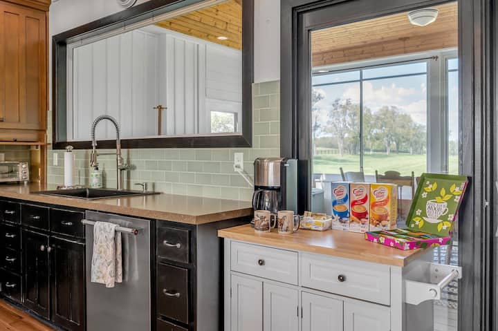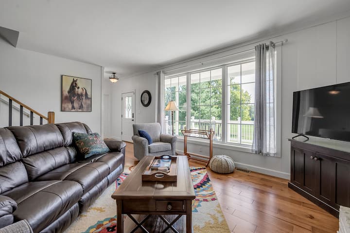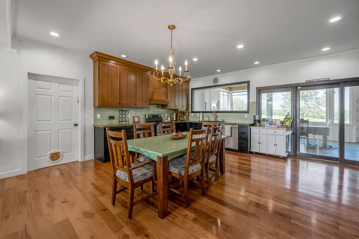 Belle maison d'hôtes dans un domaine de campagne luxuriant et vallonné. Située au cœur de la région de Bluegrass dans le Kentucky, cette maison est une petite ferme équestre de sport familiale. Venez profiter du calme et de la beauté de la vie à la ferme. Les propriétaires vivent à la ferme. La maison dispose du chauffage central et de la climatisation. La maison dispose de 2 chambres en bas, chacune avec un lit Queen Size et une salle de bain privée attenante. L'étage dispose de 2 chambres, dont l'une avec un lit King CA et l'autre avec 2 lits jumeaux. Les chambres sont reliées par une salle de bain complète partagée. La chambre King dispose d'une télévision intelligente. Cuisine complète, entièrement approvisionnée pour vos besoins de cuisine, épices et tout. Bar à café et à thé, mijoteuse, grille-pain, machine à pop-corn et tous les ustensiles de cuisine. Profitez d'être assis dans le salon ouvert avec vue sur la ferme, un canapé inclinable, un poêle à bois et une grande télévision connectée à écran plat. ** Le bois n'est PAS fourni par l'hôte. La table de cuisine peut accueillir 8 personnes, rallonge dans le placard de la chambre arrière et chaises supplémentaires dans les chambres. La maison dispose d'une connexion Wi-Fi. Profitez d'un porche arrière entièrement clos et entièrement meublé qui donne sur l'arrière de la ferme avec une table pour 8 personnes. Buanderie séparée avec lave-linge et sèche-linge.