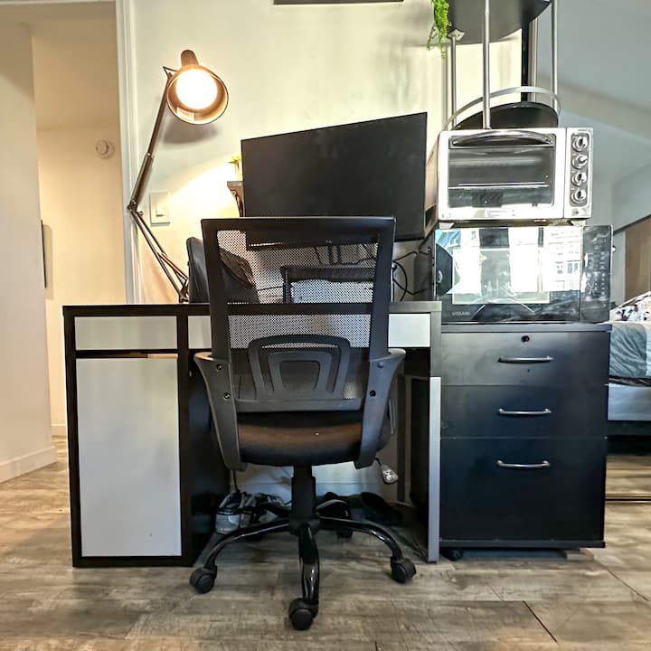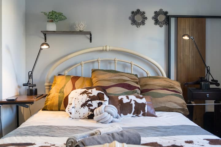 Préparez-vous pour un séjour unique dans ce studio sur le thème des cow-boys, où l'esprit du Far West rencontre le confort moderne. Cette retraite confortable est conçue pour vous transporter au charme accidenté d'un ranch occidental tout en vous offrant toutes les commodités dont vous avez besoin. L'espace dispose d'une décoration rustique, y compris des accents de bois de style grange, des chapeaux de cow-boy vintage et des meubles en cuir. Un lit queen size moelleux, habillé d'un couvre-lit matelassé et d'oreillers à motifs de cow-boy, assure une nuit de sommeil confortable. Des touches occidentales classiques comme des fers à cheval, une roue de chariot et des œuvres d'art encadrées de mustangs galoping donnent vie au Old West.