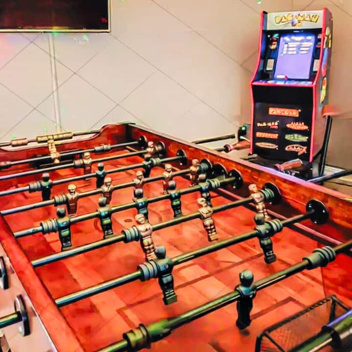 🎲 Une table de poker, un baby-foot, un Jenga géant et une variété de jeux de société pour les soirées de jeux.