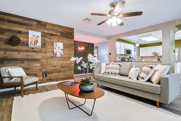 Découvrez le mélange parfait de plaisir et de détente au Texas dans cette maison spacieuse de 5 chambres et 3 salles de bain à Round Rock, à seulement 20 minutes du centre-ville d'Austin. Idéal pour les familles, les groupes d'amis, les équipes sportives ou les réunions, il peut accueillir jusqu'à 16 personnes et regorge de divertissements pour créer des souvenirs durables. Pas besoin de quitter la propriété pour l'excitation!