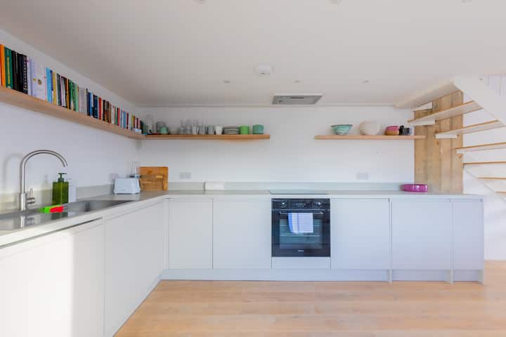 Récemment rénové de haut en bas, chaque centimètre carré de cet espace dispose d'intérieurs sur mesure et faits à la main et de finitions modernes qui combinent confort contemporain et un clin d'œil à la riche histoire du bâtiment. Chaque détail a été soigneusement préparé pour s'adapter à l'espace, garantissant une expérience luxueuse et personnelle. Son minimalisme d'inspiration scandinave permet à la lumière naturelle de remplir chaque coin de l'espace tandis que les meubles triés sur le volet et le plafond en béton ajoutent charme et caractère, donnant à l'espace une sensation de style loft. La cuisine ouverte et le séjour/salle à manger sont conçus pour la socialisation et la détente, tandis que la chambre en mezzanine offre un refuge confortable donnant sur l'espace de vie lumineux et aéré en dessous.