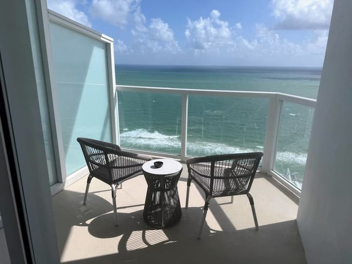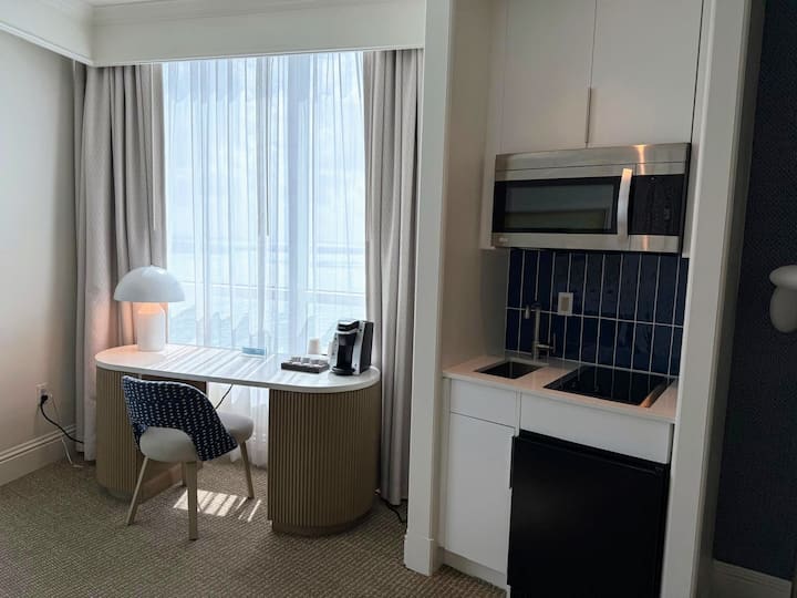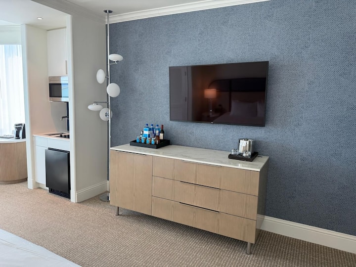 Cette suite junior rénovée au 32e étage en bord de mer Tresor est située dans la luxueuse tour Tresor dans le Fontainebleau Hotel, à Miami Beach. Le logement offre plus de 520 pieds carrés d'espace intérieur, une kitchenette et un grand balcon extérieur.