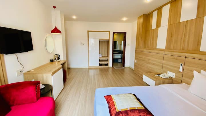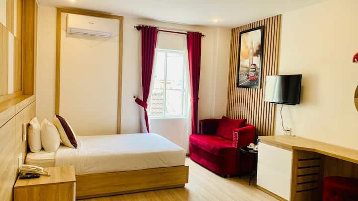 Un logement idéal pour vos vacances courtes ou longues dans la ville côtière de Danang. La chambre privée comprend une salle d'eau privée avec une douche chaude, un bureau avec une connexion Internet super rapide. Cet endroit charmant est très proche des boutiques et restaurants populaires.