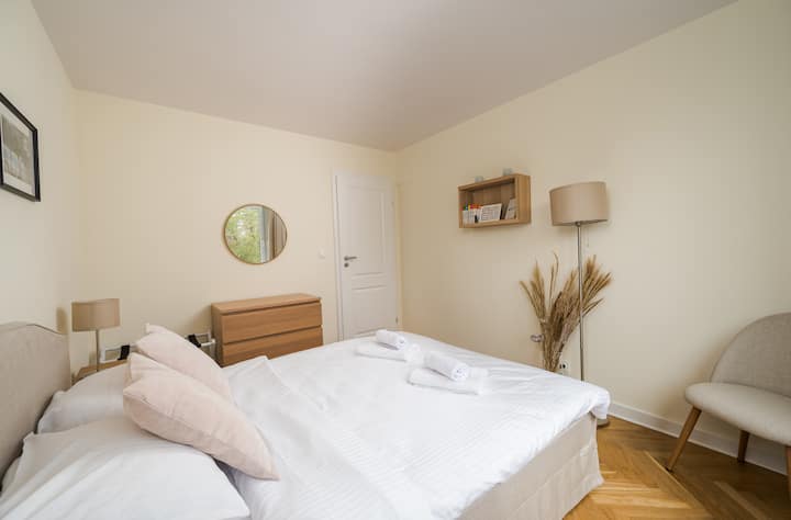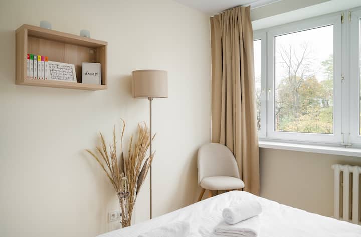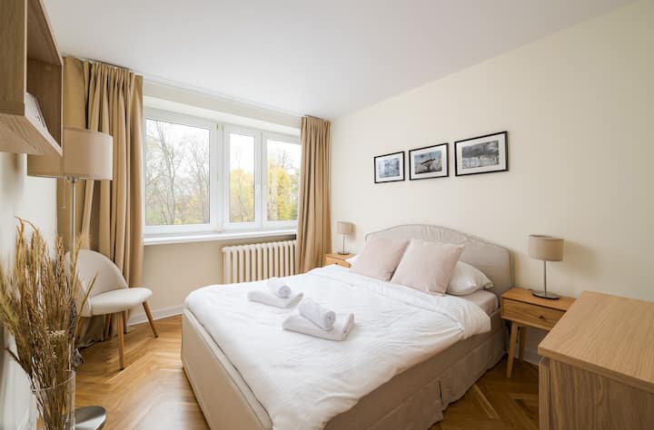 L'appartement se trouve à seulement 15 minutes de marche du palais de la culture et de la science, où vous pourrez prendre un ascenseur jusqu'à la terrasse d'observation et profiter d'une vue magnifique sur la ligne d'horizon de Varsovie. À proximité, de nombreuses attractions touristiques méritent d'être visitées, telles que le Musée national, le musée de l'Asie et du Pacifique, le National Philharmonic, le NBP Money Center et le Fryderyk Chopin Museum, entre autres. L'appartement est également entouré de vastes espaces verts comme Beyer Park, Bohdan Wodiczko Square, J. Porazińska Park et Marshal Edward Rydz-Śmigły Park. Ce sont des endroits parfaits pour marcher, faire du jogging, faire du vélo ou se détendre en pleine nature sans quitter le centre-ville.