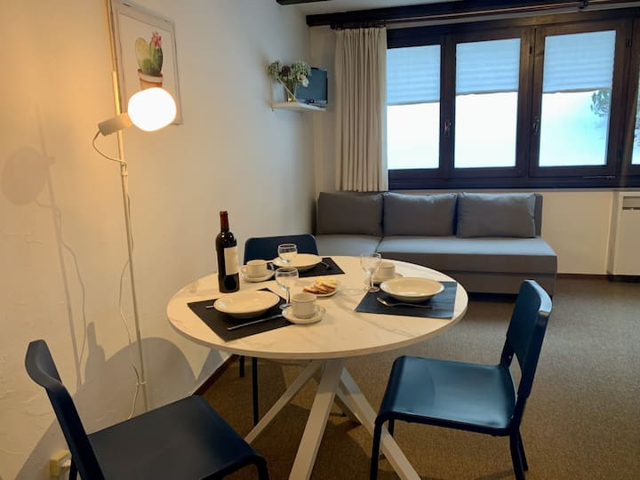« Apt. 33-1 », appartement 1 pièce 32 m2, au rez de chaussée, position nord. Objet adapté pour 2 adultes + 1 enfant. Mobilier confortable et douillet : salon/salle à manger avec 1 canapé-lit (140 cm, longueur 190 cm), 1 lit double pliant (160 cm, longueur 190 cm), télévision numérique et écran plat.