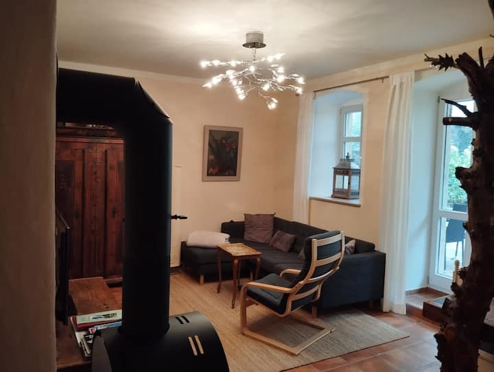 Le salon central convainc par son charme rustique : un ancien établi a été transformé en une table à manger unique, soutenue par un morceau massif d'un pommier royal et créant une atmosphère particulière. Un poêle à bois que vous pouvez allumer vous-même à votre guise. De là, vous accédez directement à la terrasse, qui est équipée d'un espace extérieur privé, y compris un barbecue – parfait pour profiter du jardin idyllique.