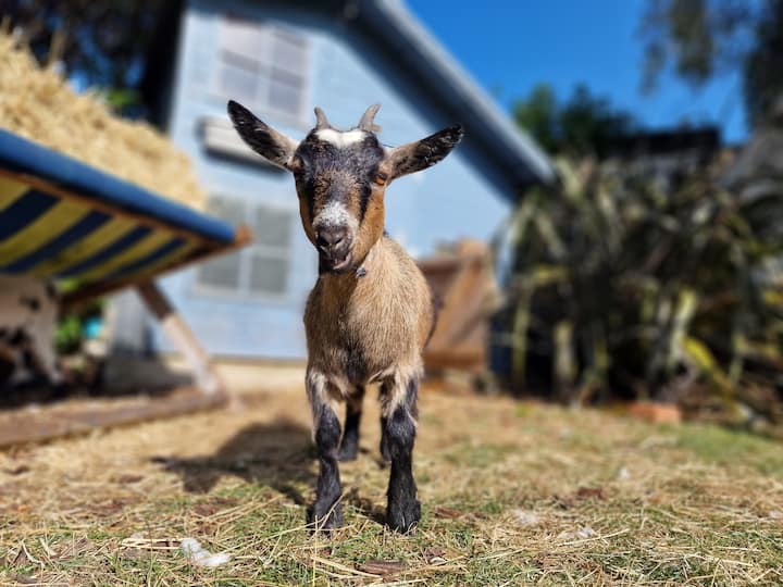 Nous avons 2 teckels (chiens saucisses) un cochon nommé (Pablo) 2 chèvres et poules pygmées