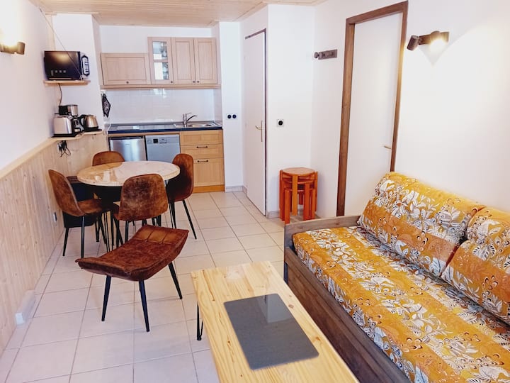 Appartement confortable 3* de 28 m2 au rez-de-chaussée. Séjour ensoleillé en période estivale, télévision à écran plat. Cuisine ouverte équipée avec 2 plaques vitrocéramique, frigo (sans partie congélateur), lave-vaisselle, une cafetière à filtres, bouilloire, micro-ondes et grille-pain.