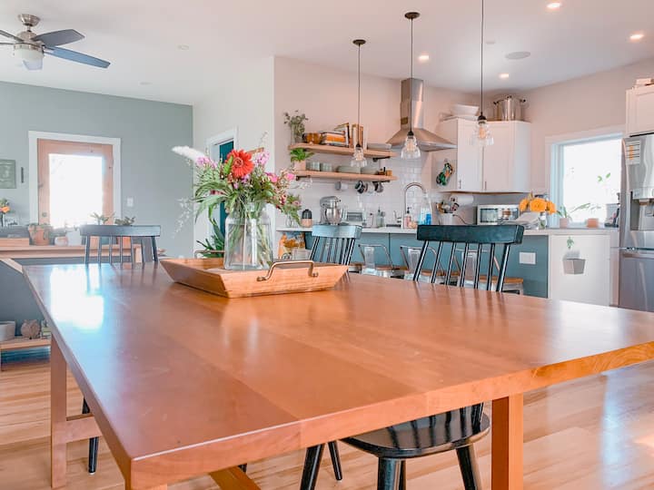 La cuisine complète dispose d'une cuisinière à induction, d'un four à convection, d'un lave-vaisselle, d'un réfrigérateur et d'un congélateur de taille familiale avec machine à glaçons, four à micro-ondes, grille-pain, mixeur, cafetière goutte-à-goutte et bouilloire. Les ustensiles de cuisine de base, y compris les épices, l'huile, les casseroles, les poêles, la vaisselle et les ustensiles sont tous fournis. Ustensiles de cuisine avec ustensiles pour le homard et les clambakes également inclus. (C'est notre maison 10 mois par an, il y a donc beaucoup de fournitures de cuisine que vous pouvez utiliser, ainsi que de l'espace de garde-manger pour le stockage des aliments.) Nous participons également au programme de compostage de Portland et disposons de bacs de recyclage que vous pouvez utiliser pendant votre séjour. Beaucoup de places assises avec une table de salle à manger pour 8 personnes, ainsi que des sièges insulaires supplémentaires pour 4 personnes.