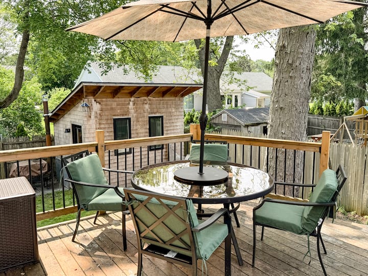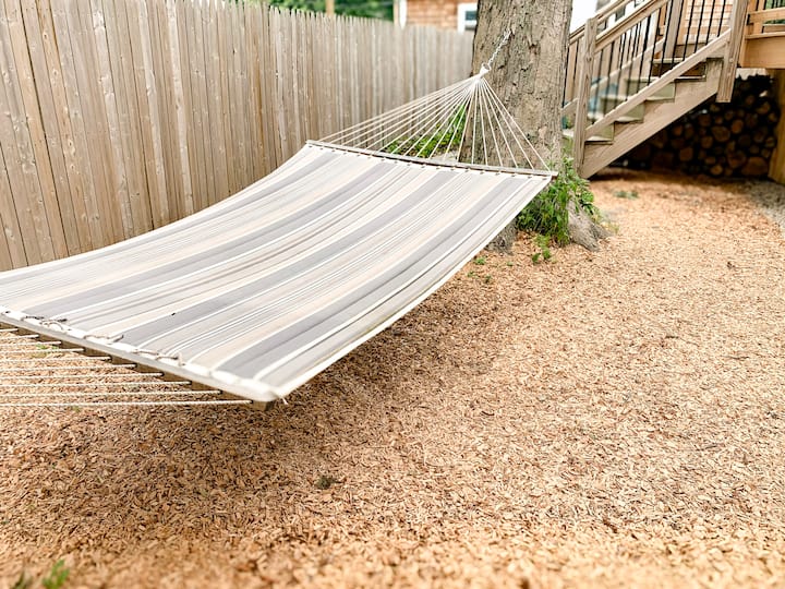 Le jardin clôturé comprend un foyer en pierre avec chaises adirondack, hamac et jardins environnants. Des escaliers mènent de la zone de la cheminée à la terrasse où vous trouverez le barbecue et la salle à manger extérieure avec un parasol pour l'ombre. (Outils de cuisson et réservoir de propane fournis)