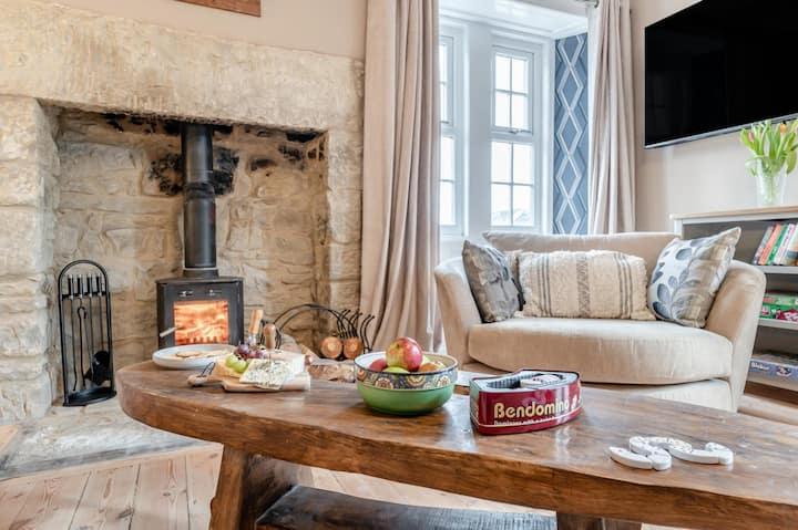 Entrez par le coffre, parfait pour ranger les manteaux et l'équipement d'extérieur, et dans l'élégante cuisine/salle à manger. La pièce maîtresse est une cheminée en brique apparente avec un Rayburn alimenté à l'huile traditionnel, complété par une grande table à manger et un bar pour le petit-déjeuner. Juste à côté du couloir, les deux salons magnifiquement aménagés disposent chacun d'un poêle à bois, d'une télévision connectée et de sièges confortables, idéaux pour des soirées confortables. Une chambre simple avec salle d'eau attenante se trouve également au rez-de-chaussée. À l'étage, il y a deux chambres familiales spacieuses, chacune avec un lit king size et un lit simple. L'une comprend une salle d'eau attenante, tandis que l'autre dispose de fenêtres à double aspect et d'un coin salon tranquille. Une troisième chambre king size dispose également d'une salle de bains privative et d'un espace de détente pour se détendre. La chambre superposée joyeuse est parfaite pour les voyageurs plus jeunes, et la salle de bain familiale complète le sol.