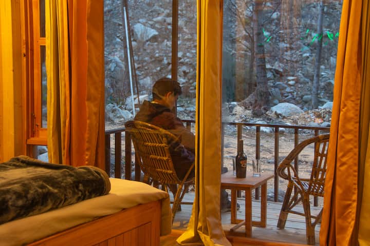 Les intérieurs sont dotés de lits confortables, de murs en bois chaleureux et de grandes fenêtres qui laissent entrer la lumière naturelle. Vous profiterez d'une terrasse privée à l'arrière (face à la rivière), parfaite pour le thé du matin ou les conversations du soir. Le grenier au-dessus s'ouvre sur un petit balcon à l'arrière, offrant une vue sereine : un côté donne sur la rivière, tandis que l'autre côté fait face au campus luxuriant et aux montagnes majestueuses.
