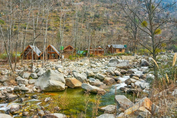 Des chalets en A nichés dans la nature sauvage près de la paisible rivière Tirthan. Ces logements magnifiquement conçus offrent une vue imprenable sur les montagnes, des intérieurs en bois, des salles de bain privées et une literie confortable pour une retraite reposante. Profitez de sièges extérieurs, d'un foyer et du son apaisant de la nature. Des repas préparés avec des produits locaux sont disponibles moyennant un supplément. Accessible par une route privée, notre propriété garantit une escapade isolée et paisible parfaite pour renouer avec la nature et se détendre avec vos proches.