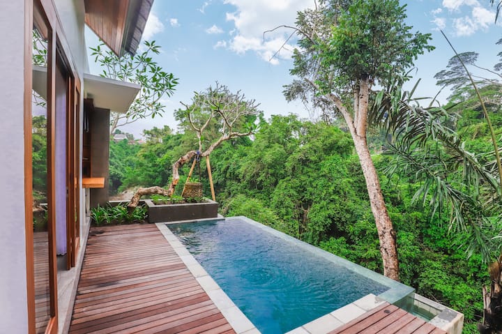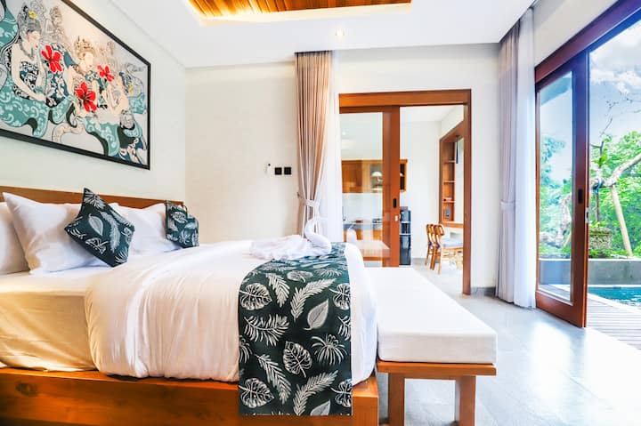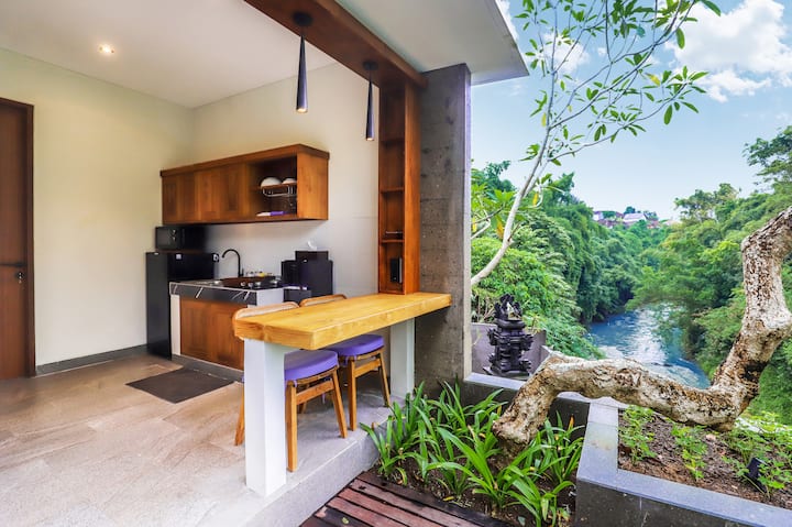 Villa d'une chambre récemment construite dans le sud d'Ubud, offrant l'équilibre parfait entre intimité, luxe et commodité. Nichée juste au bord de la haute rivière, la villa dispose d'une piscine à débordement privée qui surplombe le lit de la rivière et la jungle luxuriante de l'autre côté de l'eau, offrant une vue imprenable.