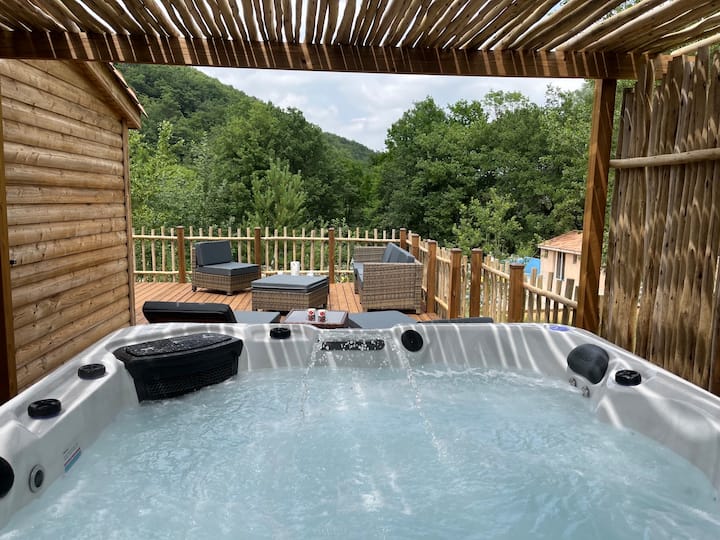 D'une terrasse de 70 m2 avec SPA privatif, salon bas de jardin et 2 bains de soleil, 1 table + 6 chaises, 1 parasol, 1 store, 1 plancha et son chariot.