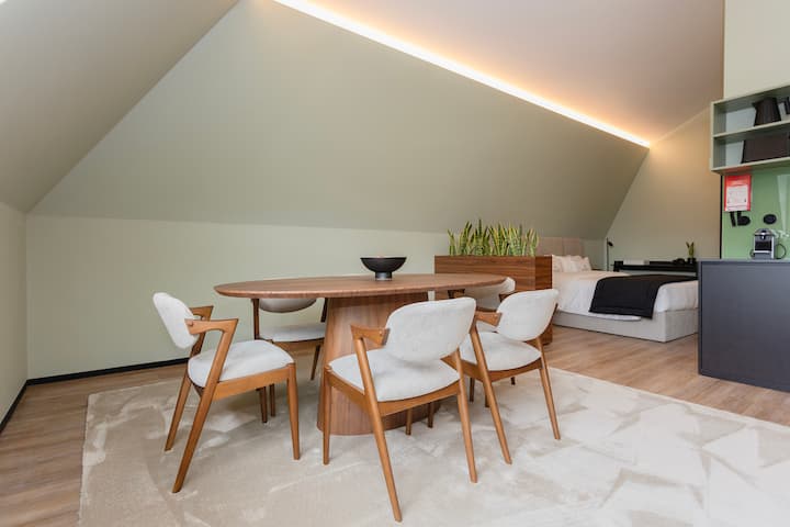 Cet appartement est un loft spacieux avec un lit double queen size, complété par un bureau fonctionnel. Si vous voyagez avec des enfants, nous pouvons fournir un canapé-lit queen size et un lit pour bébé, ainsi que des équipements de base supplémentaires tels qu'une chaise haute et une baignoire pliable pour bébé, tous disponibles sur demande.