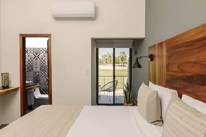 Chambre élégante avec lit King Size à Los Cabos : patio et vue sur le golf