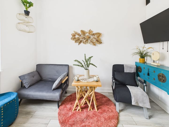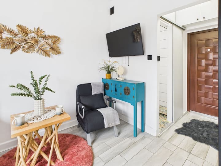 Ce studio au design fonctionnel allie des solutions modernes au confort quotidien. Les intérieurs lumineux, les accessoires soigneusement sélectionnés et l'agencement bien pensé font de l'appartement un endroit confortable pour des séjours courts et longs. L'espace de vie a été décoré en tenant compte du confort et de la fonctionnalité. Il y a un canapé confortable, idéal pour se détendre après une journée passée à explorer la ville. La télévision connectée et le wifi haut débit offrent du divertissement et un peu de détente, tandis qu'une élégante table basse complète l'arrangement, créant une atmosphère agréable. Une petite table avec deux chaises a également été placée dans cette partie de l'appartement, qui est parfaite pour dîner. Une grande fenêtre laisse entrer beaucoup de lumière naturelle, soulignant l'espace de l'intérieur. Grâce à l'utilisation d'une mezzanine, il a été possible de faire un usage optimal de l'espace studio. Au niveau supérieur, il y a un lit double, et un escalier métallique stable offre un accès pratique à cette zone. Une telle solution permet de séparer la zone de la chambre du salon, augmentant ainsi le confort d'utilisation. Une kitchenette compacte mais entièrement équipée permet de préparer des repas faits maison. Il y a une table de cuisson électrique, un réfrigérateur avec congélateur, un four à micro-ondes et une bouilloire électrique. Un ensemble complet de vaisselle, de couverts et d'ustensiles rendent la cuisine pratique et sans tracas. Les placards modernes offrent beaucoup d'espace de rangement et les plans de travail noirs élégants ajoutent du caractère à l'intérieur. La salle de bain a été conçue en tenant compte de la commodité et de l'esthétique. Il dispose d'une cabine de douche spacieuse avec des portes vitrées, d'un lavabo avec une armoire spacieuse, d'un grand miroir et d'un WC. Les équipements supplémentaires comprennent un sèche-cheveux, des serviettes et un ensemble d'articles de toilette de base. Les carreaux lumineux et les finitions modernes donnent à la salle de bain un look élégant et soigné. Avec son aménagement bien pensé et son mobilier moderne, le studio est un excellent choix pour ceux qui apprécient la fonctionnalité et le style.