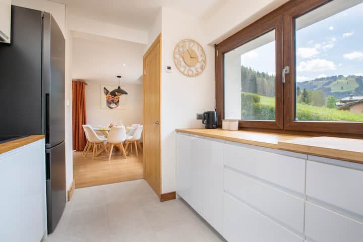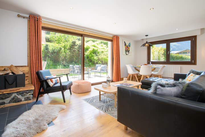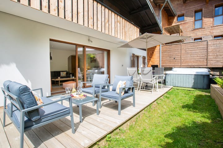 Un appartement élégant de 3 chambres avec un jardin privé, un spa et un stationnement dédié idéalement situé à distance de marche de Morzine et le long de la route du bus de ski gratuit à la fois Prodains et Pleney.