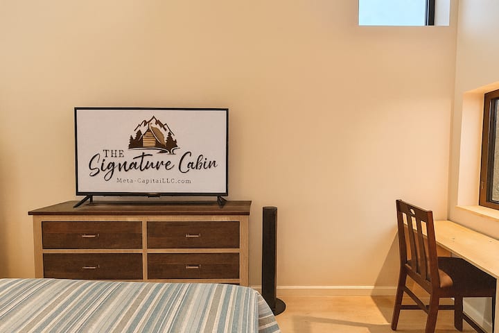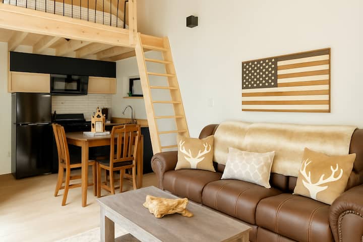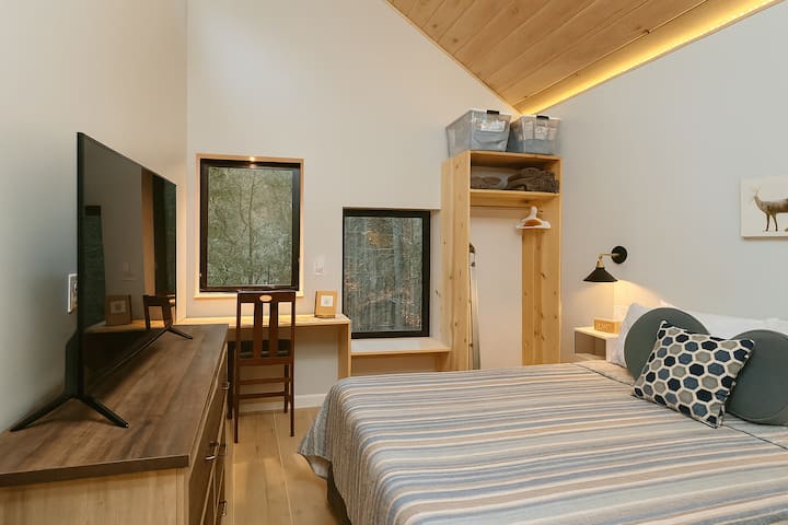 Cette tinyhome de style cabane est nichée dans les arbres, avec un acre d'intimité environnante. Profitez du paysage depuis le belvédère personnalisé, qui comprend un jacuzzi et un barbecue bicarburant, un porche couvert ou une terrasse ouverte avec des sièges Adirondack. Entrez par les portes-fenêtres pour trouver un intérieur moderne, qui a été stratégiquement conçu pour l'espace et le confort, avec : des plafonds voûtés, du bois personnalisé, une chambre surélevée avec un lit King et une chambre avec un lit Queen et un espace de bureau. Isolé mais pratique