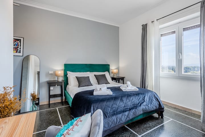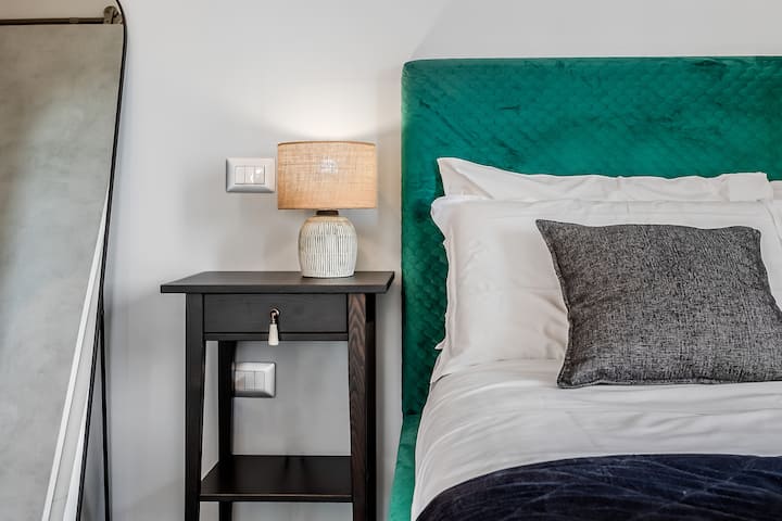 La chambre double se compose d'un grand lit double en velours vert, d'une armoire avec 3 portes pour ranger en tout confort les vêtements, de deux tables de chevet, de 2 abat-jour, de la climatisation et d'une télévision avec Netflix gratuit.