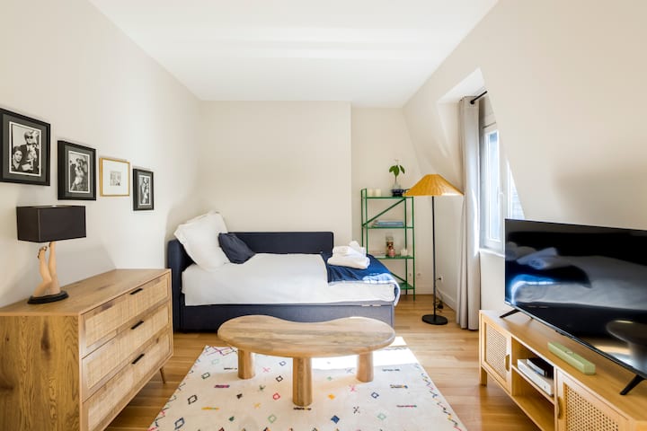 Ce studio, situé au 6e étage d'un immeuble avec ascenseur, offre une vue imprenable sur la place Saint-Sulpice, l'un des lieux les plus emblématiques du 6e arrondissement de Paris.
